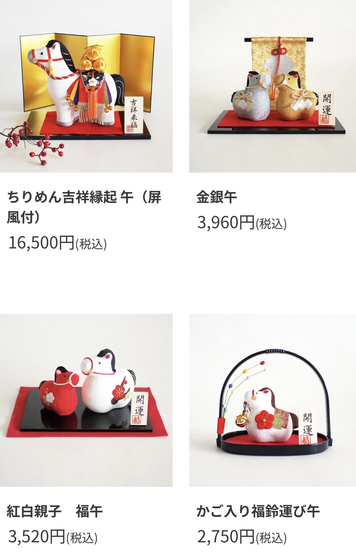 ちりめん、ガラスなどで作られた干支小物など、新年のインテリアや贈り物にふさわしい