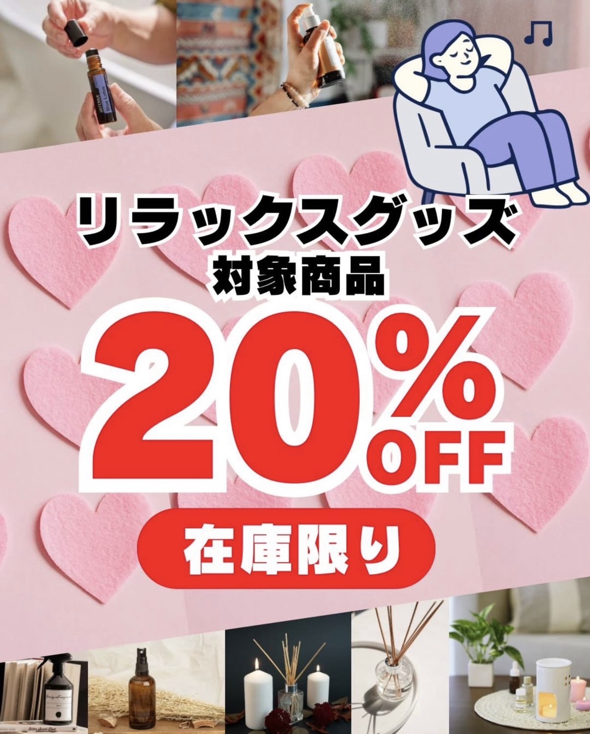 自然のかおりで心もからだも癒されるアロマテラピーを中心に、自然派のスキンケア・ボディケア、マッサージグッズ、ヘルシーフードやフィットネスグッズ、ホームフレグランス、ハーブティー、リラックスウェアなど、五感で楽しめる様々なアイテムを取り揃えました。