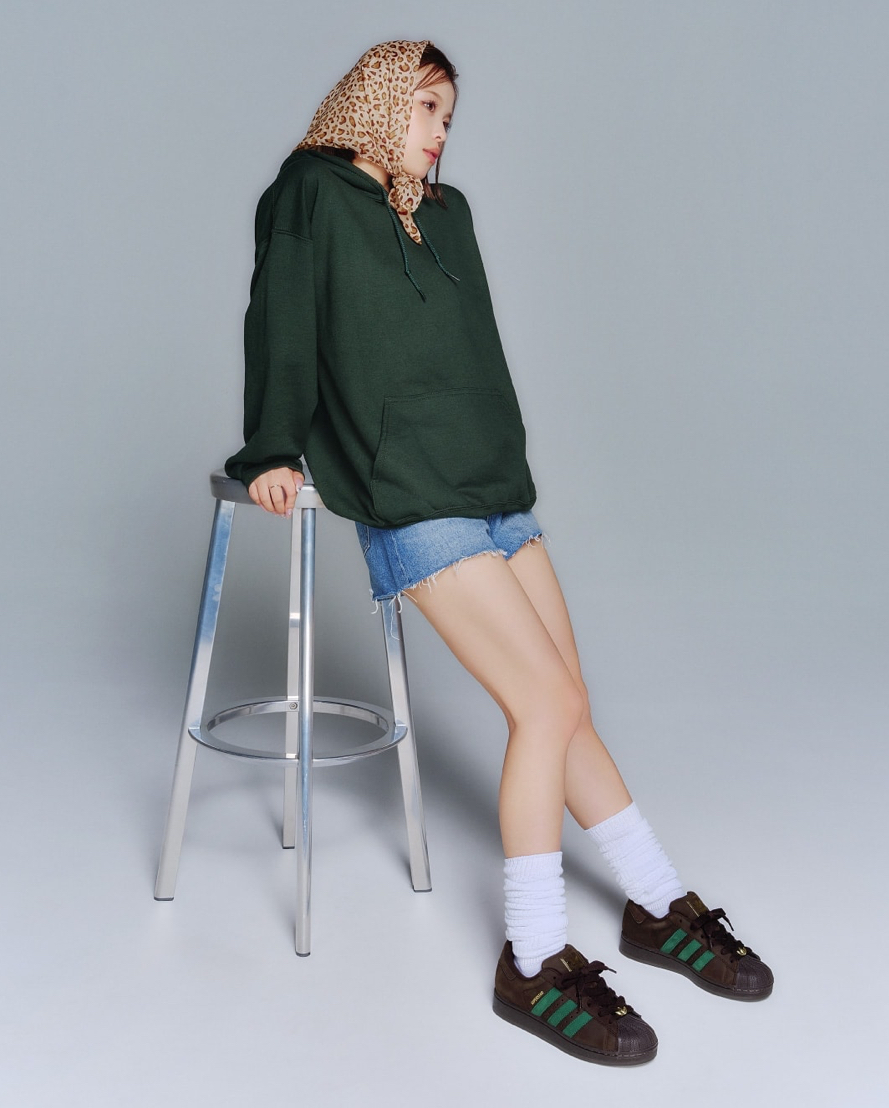 グリーンのパーカーにデニムショートパンツでシンプルにまとめつつ、
