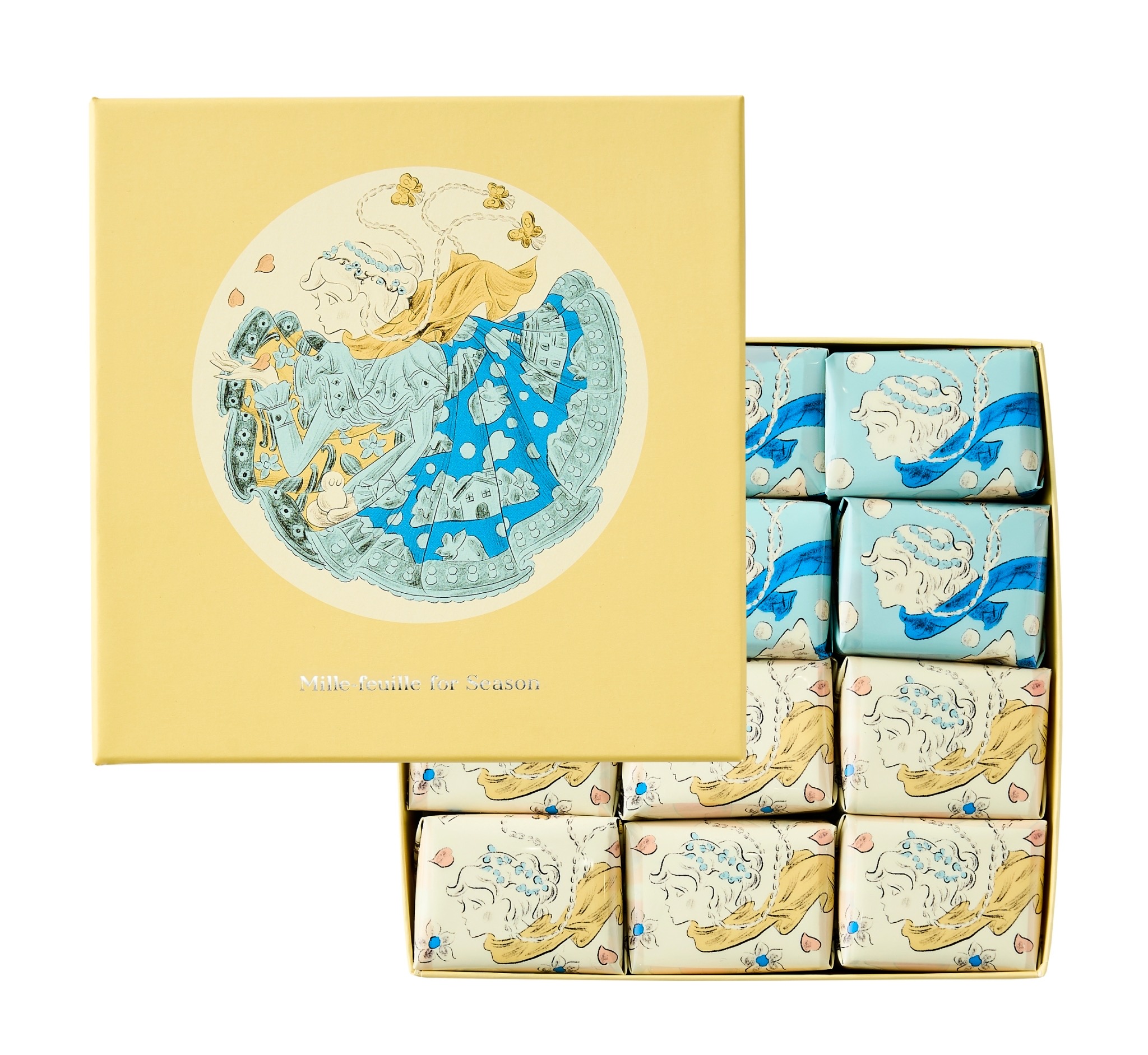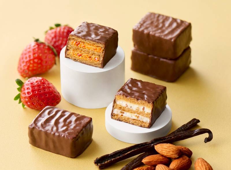 「春」をイメージした新作ミルフィユ、「キャラメル苺」と「バニラナッツ」の2種類の味を、デザイナー書き下ろしの可愛らしいパッケージでお届け!