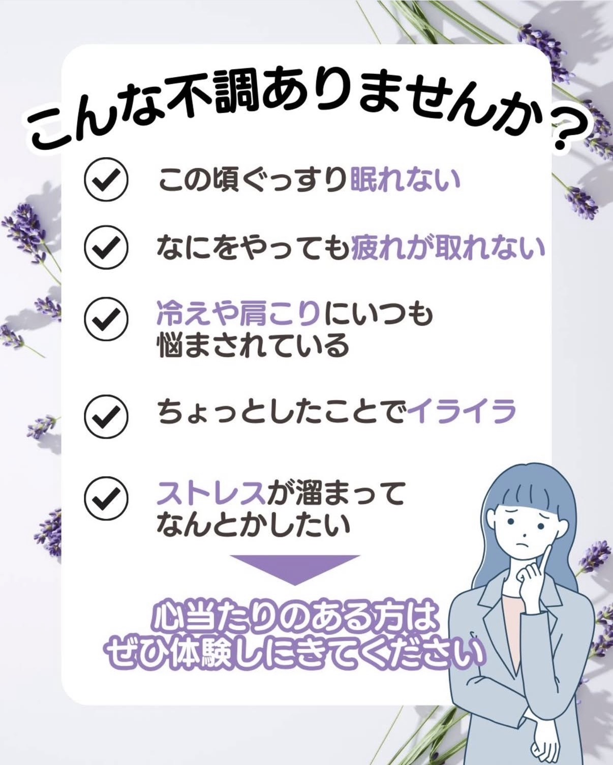 冷え性・肩こり・疲労の畜積・ストレス・睡眠の質の低下など