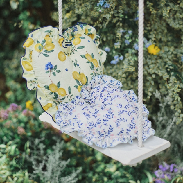 おすすめは、初夏を感じるキュートな柄とパイピング入りのフリルが印象的なハート型クッション(L/3,960円、S/3,300円税込)。ソファやベッドに置くだけで、お部屋の華やかなアクセントに。